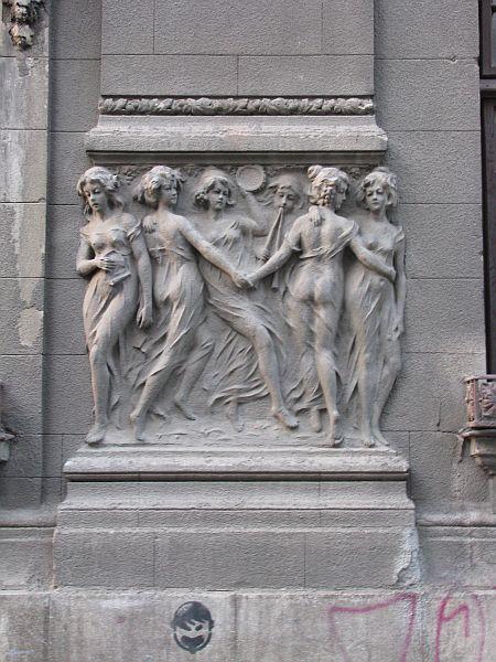 Panoul ornamental cu siluete umane pare să ilustreze un fel de joc al ielelor